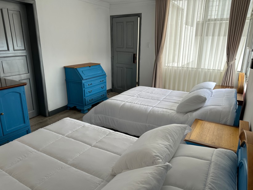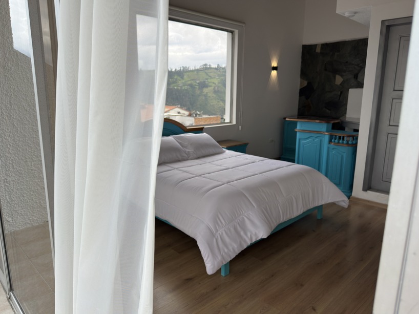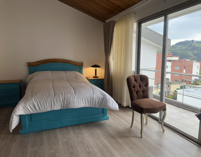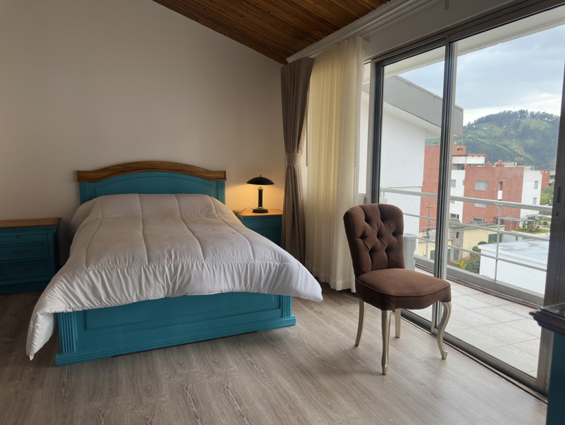 Acogedora y luminosa, nuestra habitación simple ofrece un ambiente íntimo y confortable ideal para viajeros en solitario: cama individual amplia, mobiliario con personalidad, iluminación cálida y acceso a un balcón con vista a la zona norte de Quito; un refugio práctico y elegante donde cada detalle ,desde la madera en el techo hasta los textiles suaves, está pensado para garantizar descanso y privacidad.